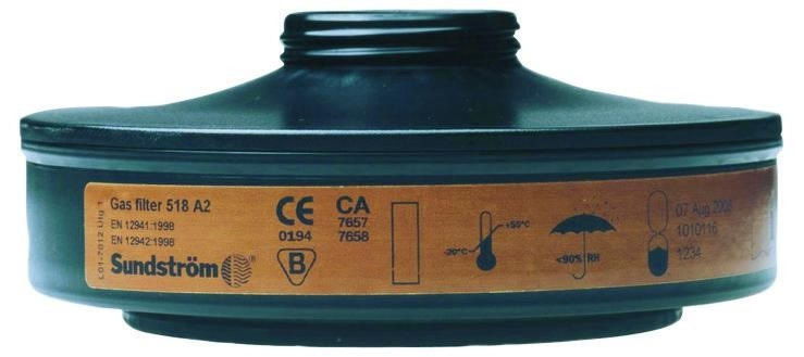 Suodatin SR 518 A2 suojaa orgaanisilta yhdisteiltä, joiden kiehumispiste on yli 65 °C, eli useimmilta liuottimilta. Puhaltimeen SR500/500 EX. EN12941, EN12942